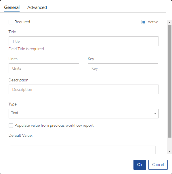- Default Value: The Default Value is used to automatically enter data in the field when the asset is created. The user may modify this value if it is incorrect for the particular asset.