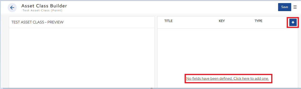 - To create a new field, select "No fields have been defined. Click here to add one." if no fields have been defined or the plus icon.
