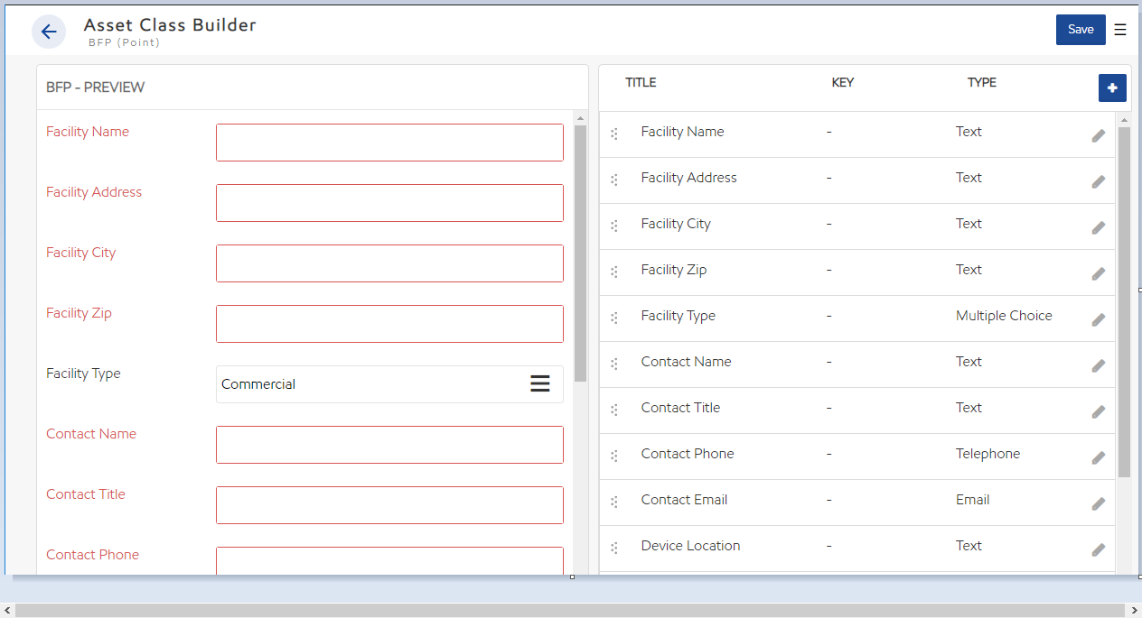 The right side of the screen allows the user to create fields. The left side of the screen displays a preview of what the list of fields will look and behave like to the end user.