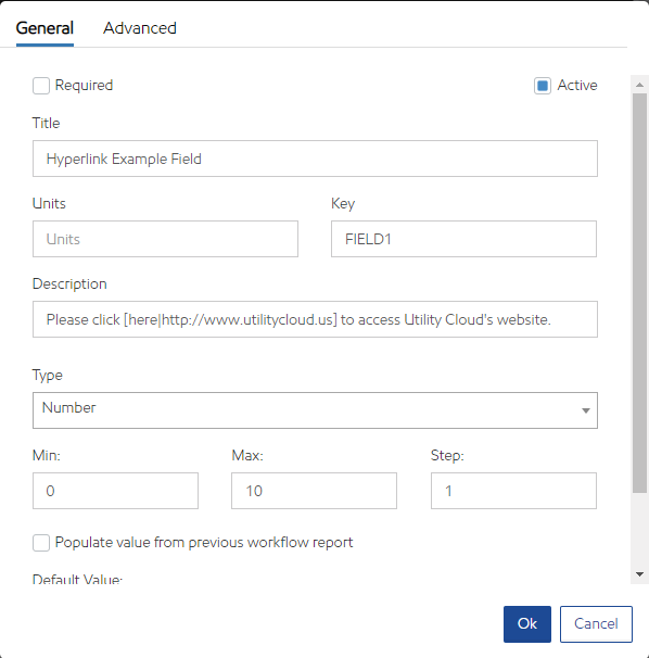 Default Value Hyperlink: If the Hyperlink is added as the Default Value, it will automatically appear for this field when the asset is created. The user may modify this value if it is incorrect for the particular asset.