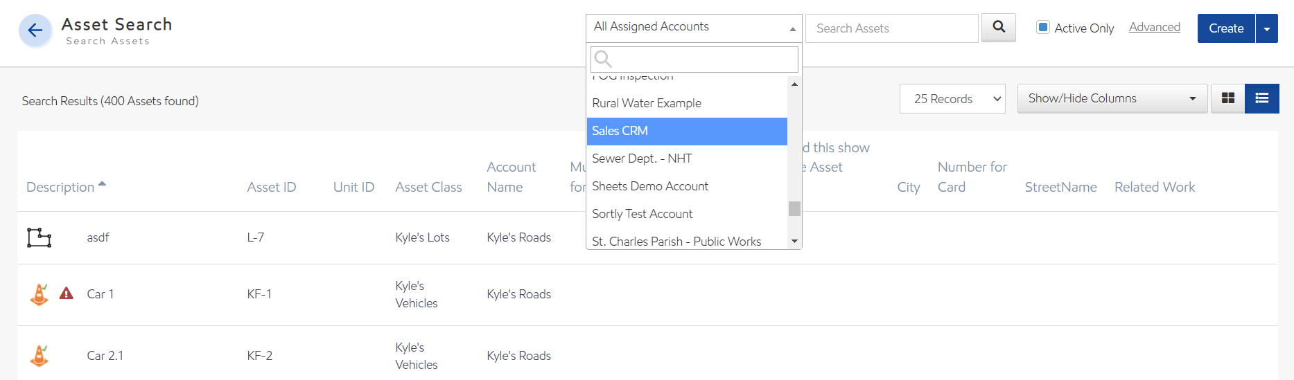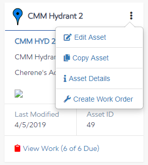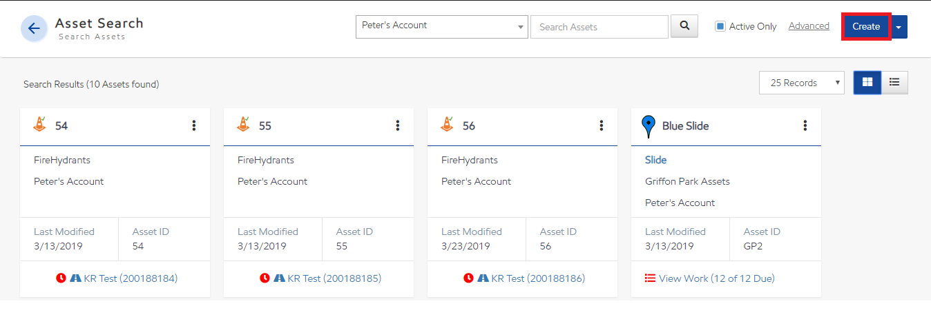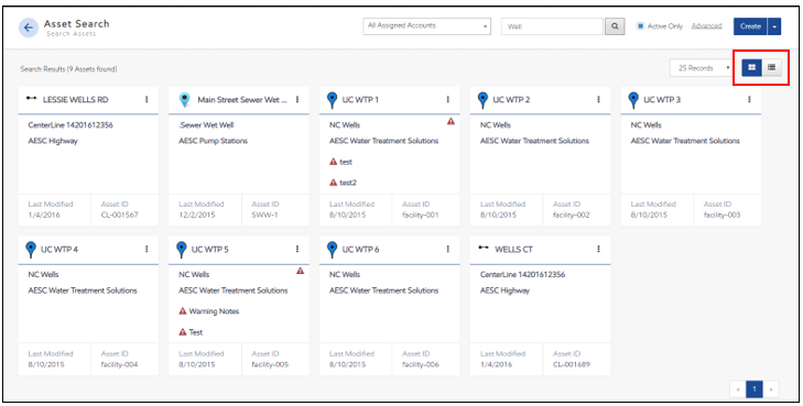The Assets tile is a centralized location to review assets, and view and edit all details associated to that asset. The search results allow you to see which workflows are associated with an asset, and quickly access the details or schedule a work request. When searching for assets, you can check the box to how Active Only, or leave the box unchecked to show both active and inactive assets. Search results give you quick access to view and edit the Details of each asset. You may also choose between a card view and a table view.