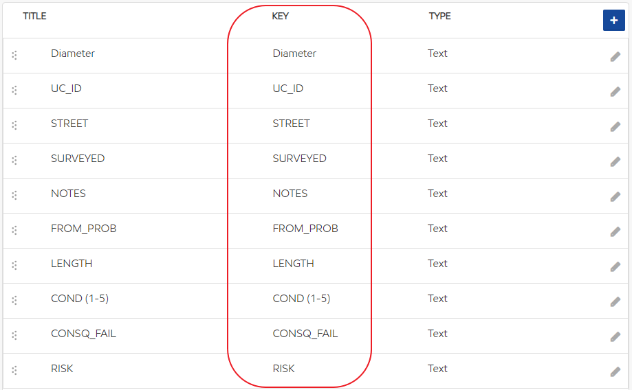 NOTE: All Asset attributes must have a KEY assigned that matches the GIS field name exactly. Asset Keys should be no longer than 10 characters and cannot have spaces.