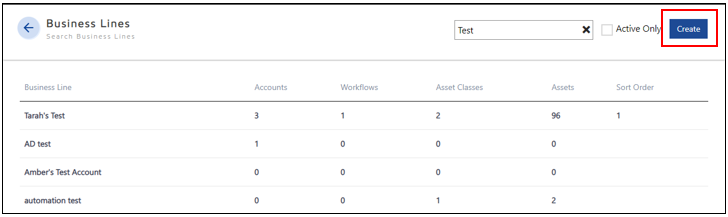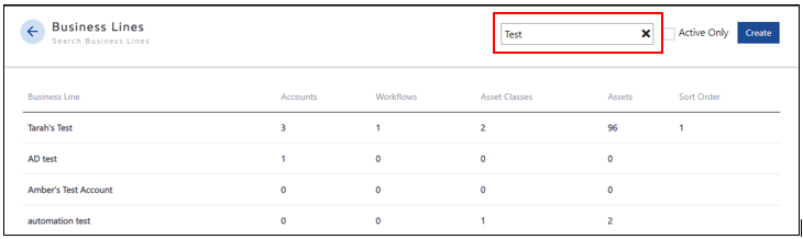 Users can access the Business Lines page from the Landing Page or left navigation menu. From there, you can view the basic details of your business line, including name, sort order, and number of associated accounts, workflows, asset classes, and assets. If you have a larger number of business lines, you can filter the page by entering any text in the upper-right search bar.