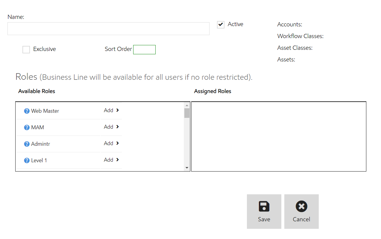 - Roles determine which security roles are associated with a business line. If no role is selected then your business line will be available to all roles.