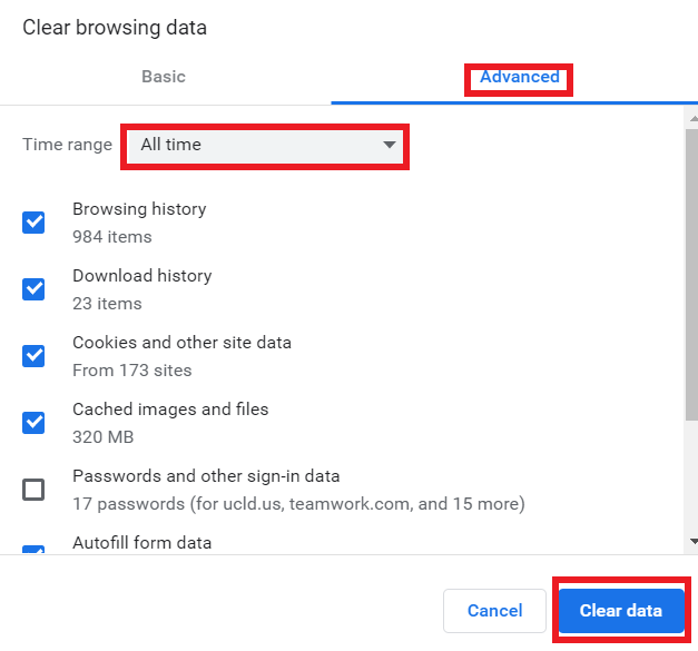 - Make sure that there's a tick mark next to 'Cookies, site data' and 'Cached images and files'.