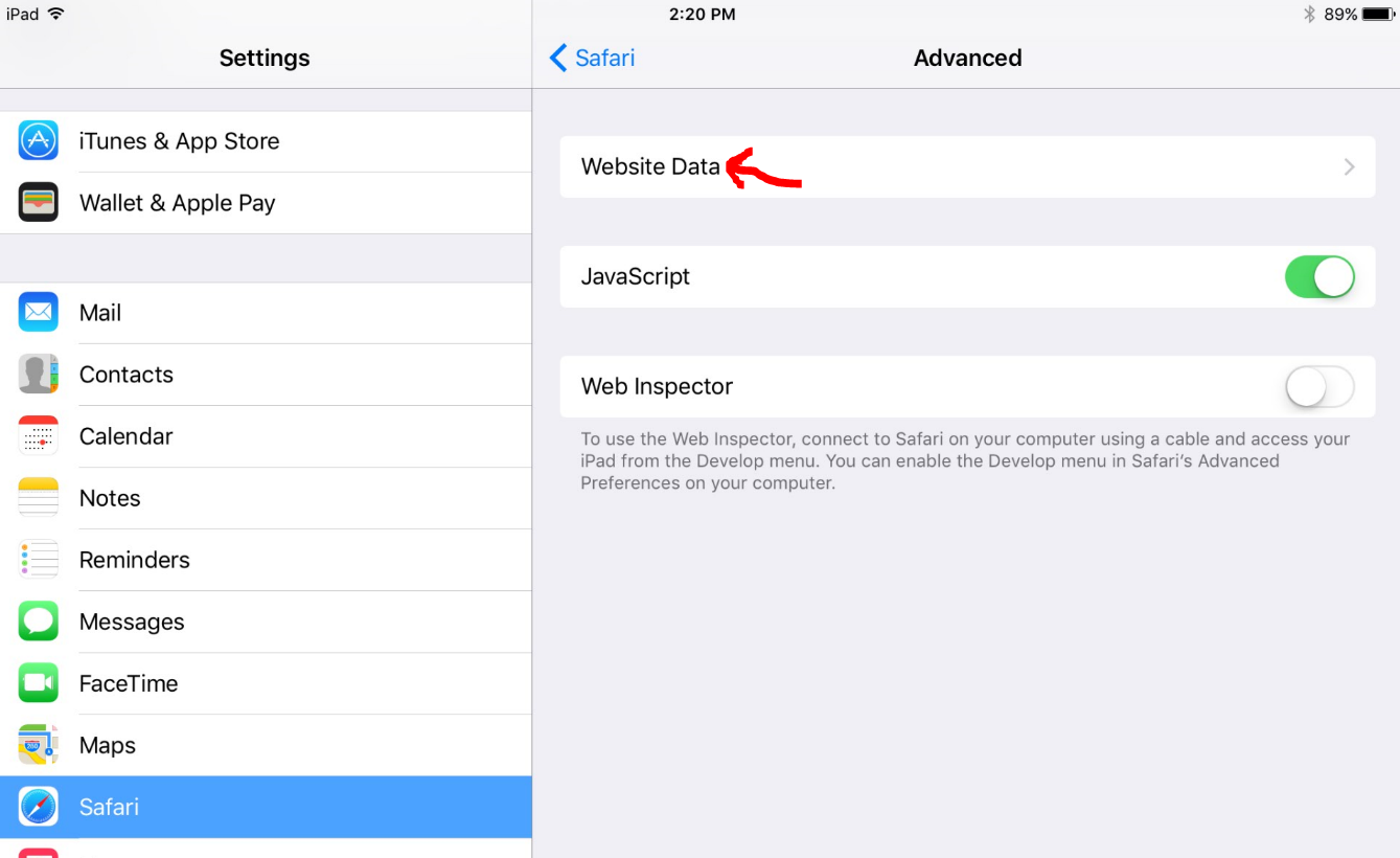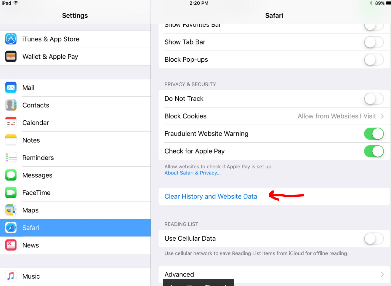 - At the bottom of Safari's settings screen, Select Clear cookies and data or Clear Cookies and Clear Cache.