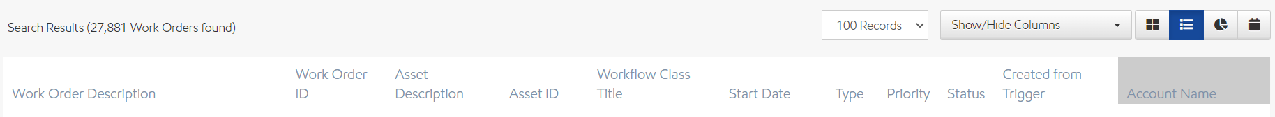 In list view, your work orders show in a list with sortable headers. You can sort by selecting the column header title and filter by entering a filter value in the text box. You can also show or hide columns by selecting which columns you'd like to see in the Show/Hide Columns dropdown. The headers include: