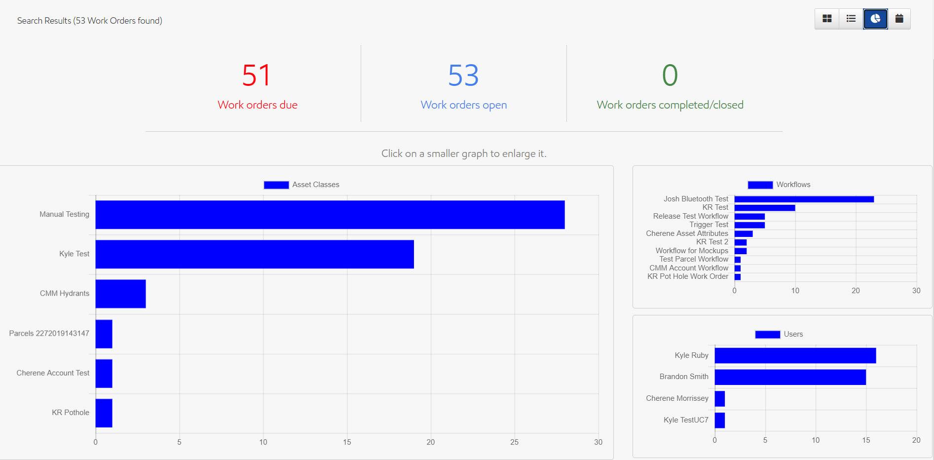 In chart view, you're shown an overview of the work orders in your current search results. This includes an overview of your due, open, and completed/closed work orders, as well as three charts showing your work orders by asset class, workflow, and assignee. You can switch which chart is the primary by selecting any of the smaller secondary charts.