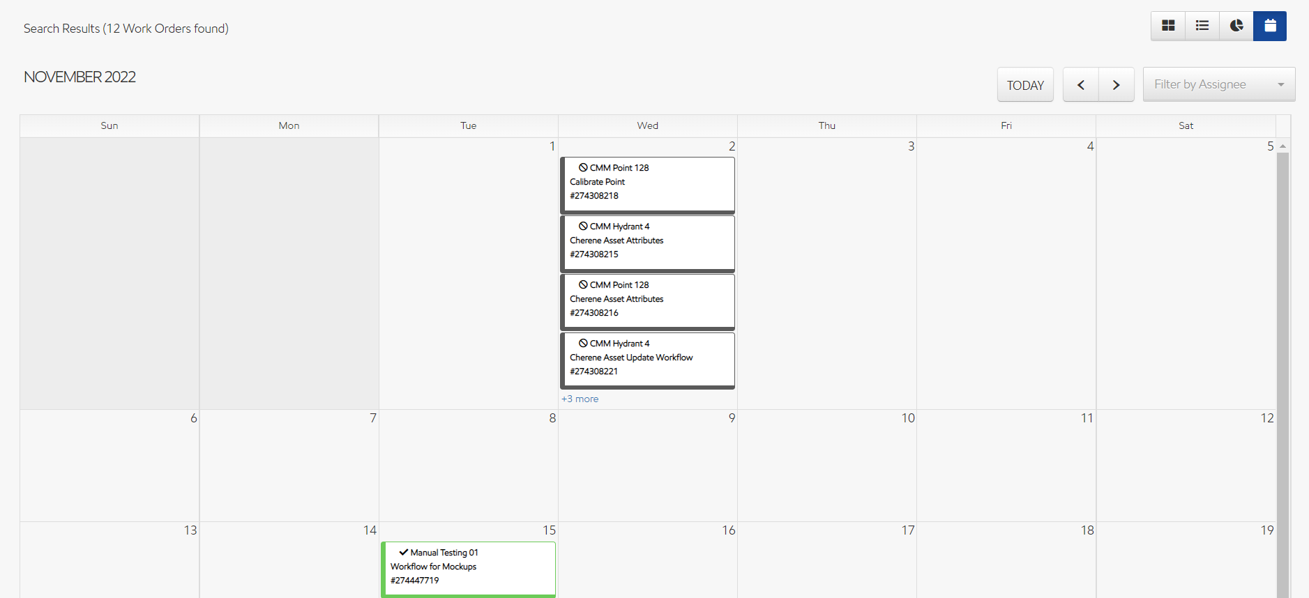 In calendar view, you're shown the work orders of your current search on a calendar, defaulting to the current month. Each work order shows as a card with the below information available: