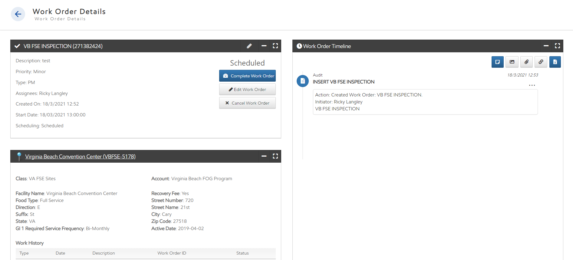 In addition to the main panel, the Work Order Details page contains an asset panel with your asset's details and recent work history, and the work order timeline panel, containing audits of your work order's history.