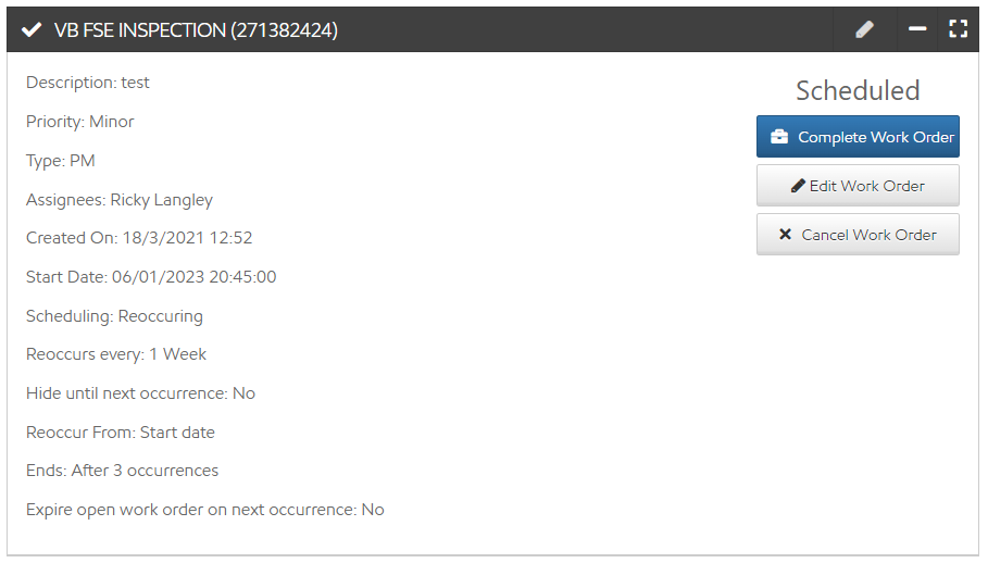 Expired work orders are any reoccurring work orders that were set to expire on next occurrence and not completed by their next occurrence. You can't complete or reopen a work order once it's been expired.