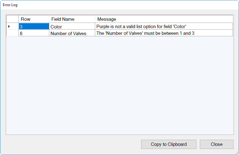 If any row fails validation, it will appear red and the specific cell will be bold. An error log will appear with a list of all rows that did not pass validation and why. These can be copied to a clipboard if necessary. Close the dialog box and correct the errors.