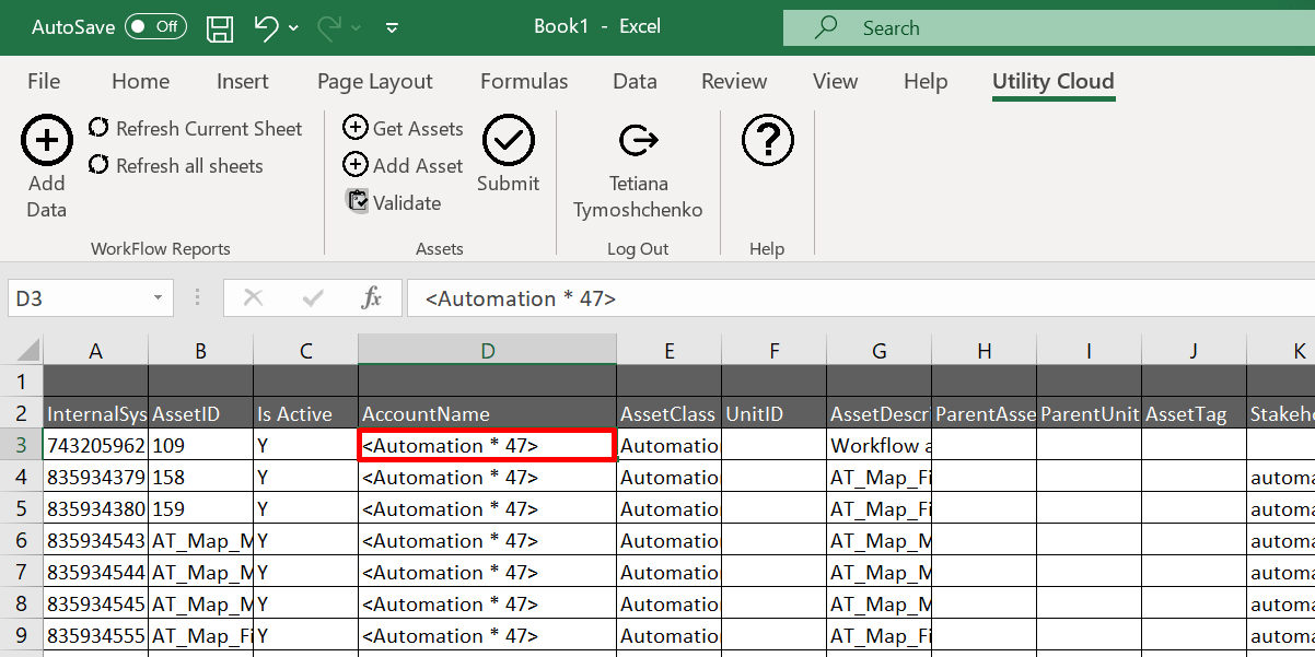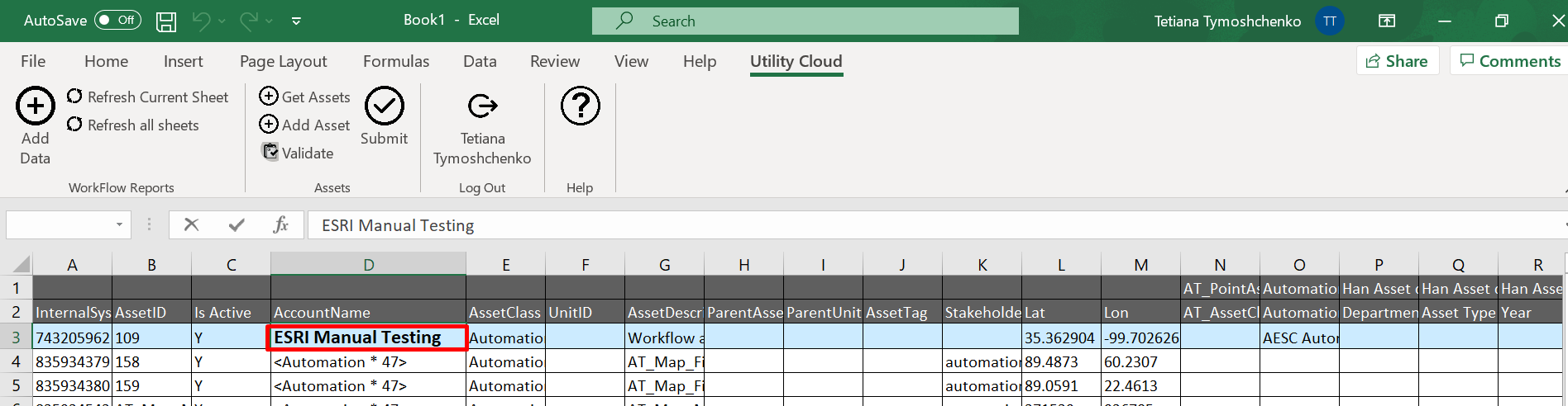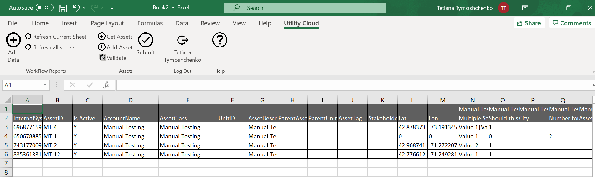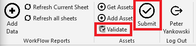 Users can validate and submit new and updated assets directly into Utility Cloud using the Excel Add-in. This can only be done on a sheet-by-sheet basis.