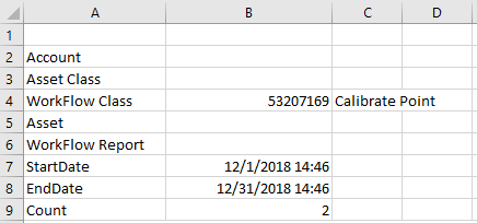 The top of the resulting sheet contains the configuration selected via the dialog box. This workbook can be saved for future use without being required to Get Data again. Simply, change the Start and End Dates or enter a different Account ID, Asset Class ID, Asset ID, Workflow ID or a specific Workflow Report ID.