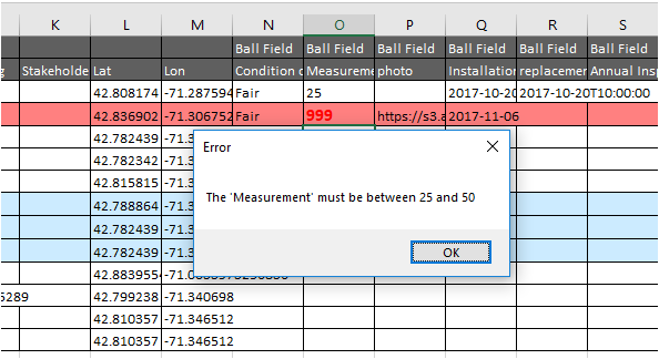 Column ‘O” was edited and failed validation as the number needs to be between 25 and 50. The field and row are highlighted in red to indicate it is invalid.