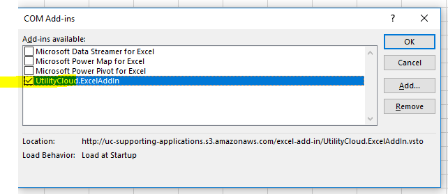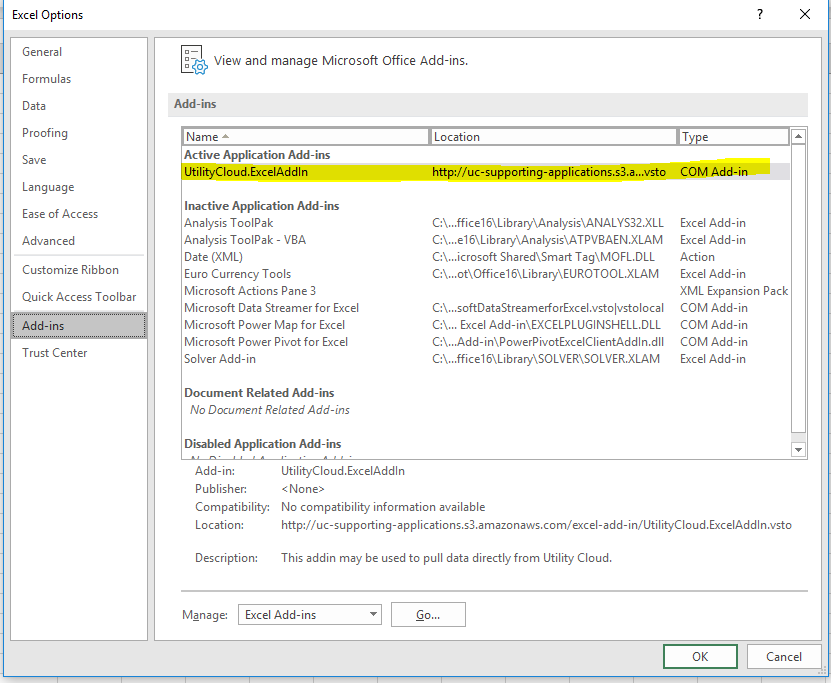 Select File; Then Options. This will open up the Excel Options. Once there you want to select Add-ins and make sure Utility Cloud is an Active Add-In. See below for an example.
