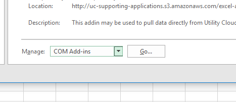 If there is nothing under Active Application Add-Ins, check under Inactive Add-Ins to see if it is there, if not you will need to reinstall. If you do see it under inactive, select Manage at the bottom and select COM Add-Ins. Make sure Utility Cloud is checked. If it is not checked, check it, otherwise, if it is missing entirely, you will need to reinstall the Utility Cloud Ribbon.
