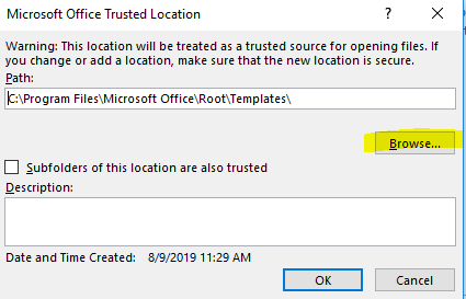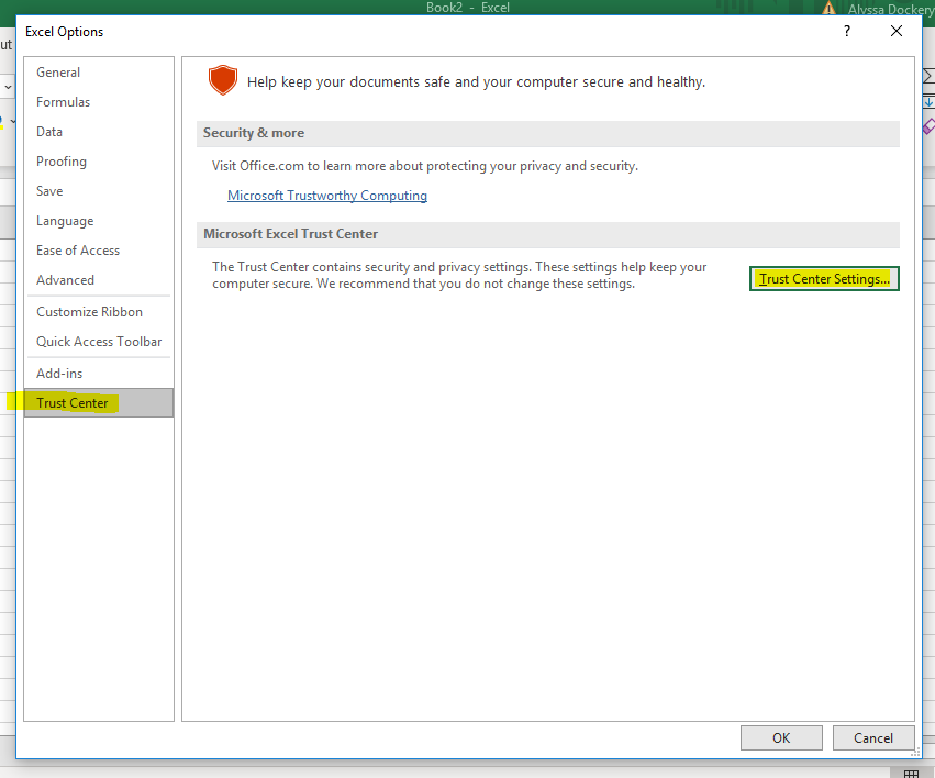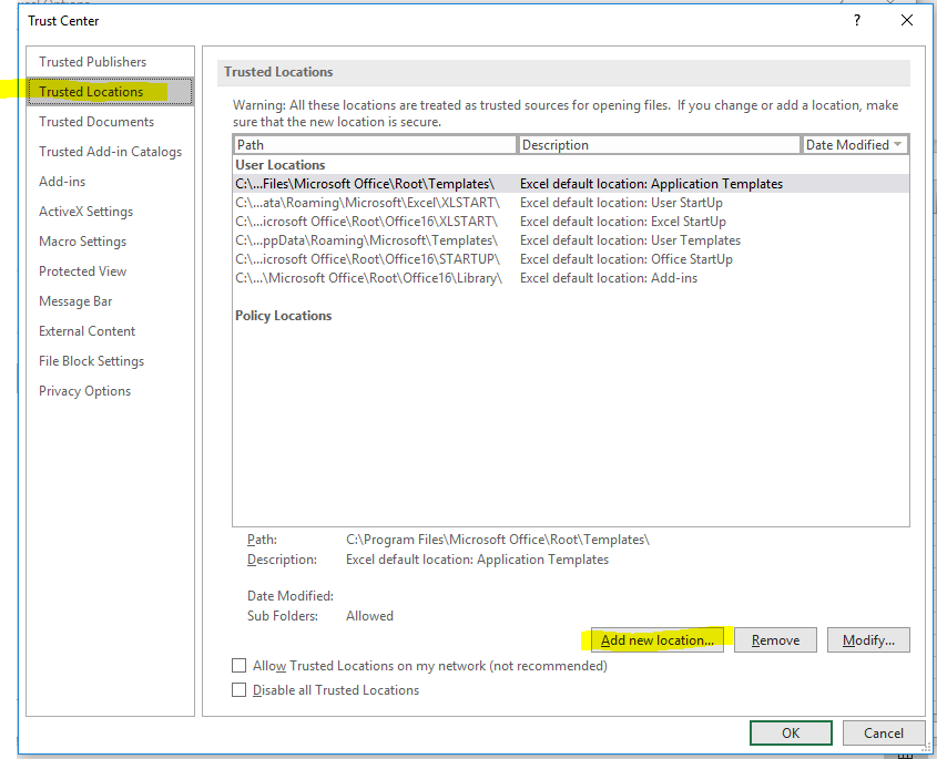 Open the Trusted Locations menu. File>Options>Trust Center>Trust Center Settings>Trusted Locations.