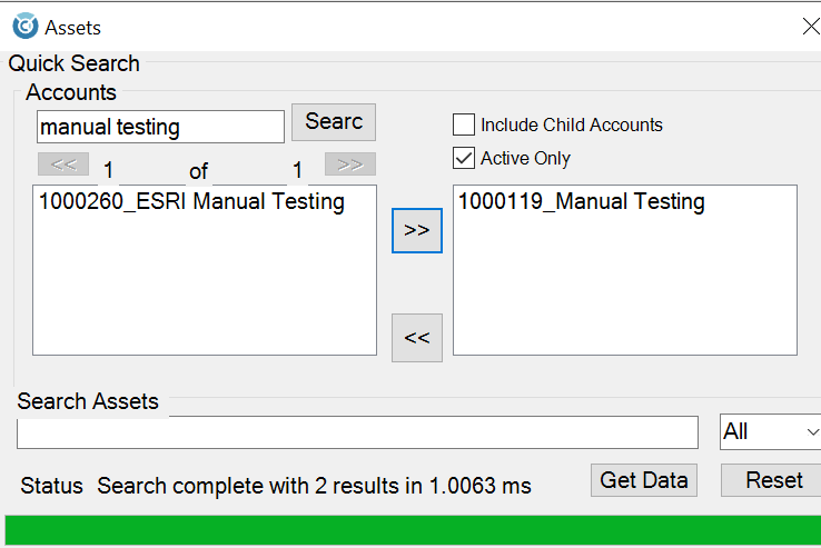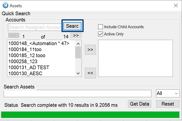 In order to Select the needed account/accounts from Search Results simply selecting the needed account/accounts and selecting the Double Right Arrows button: