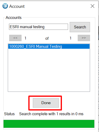 The specified account is shown in Results Returned. Select the needed account from the Search Results and select the Done button: