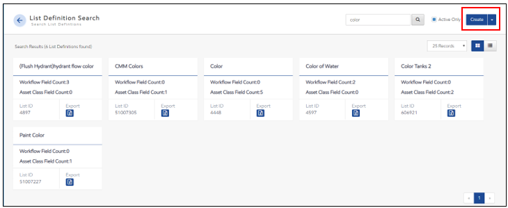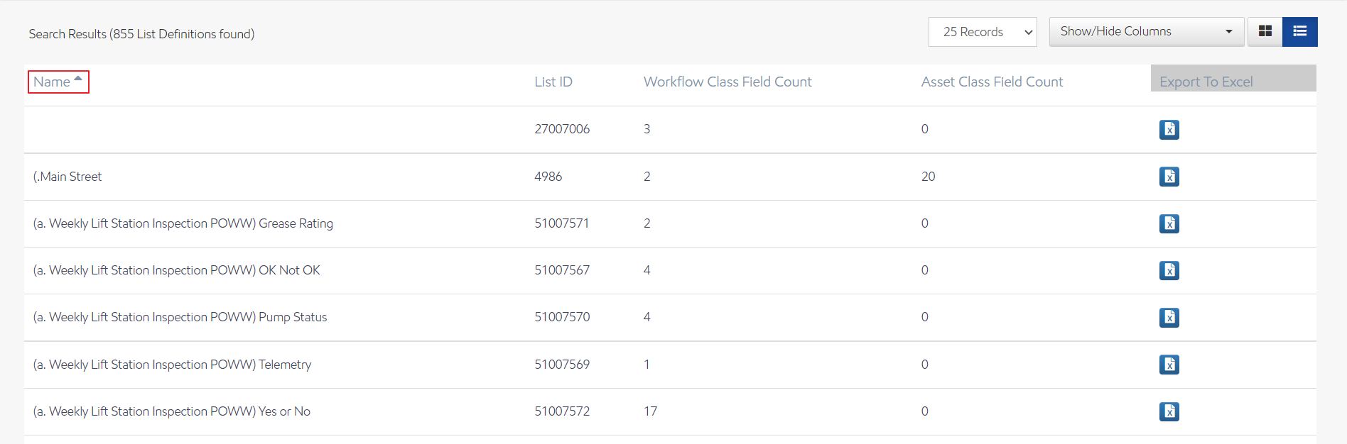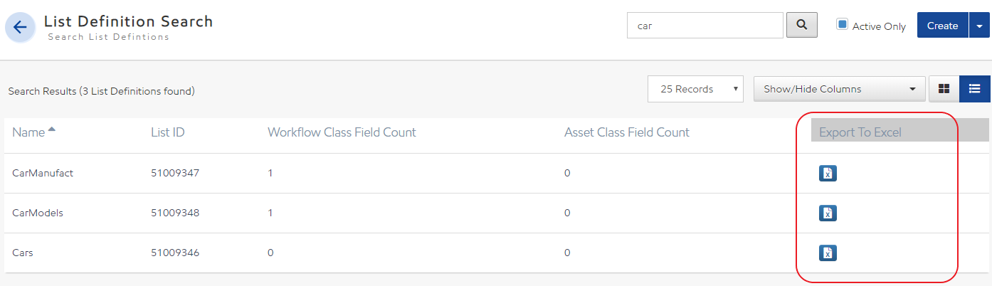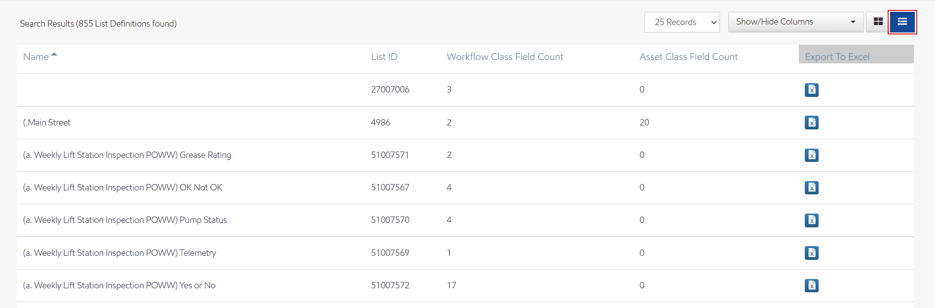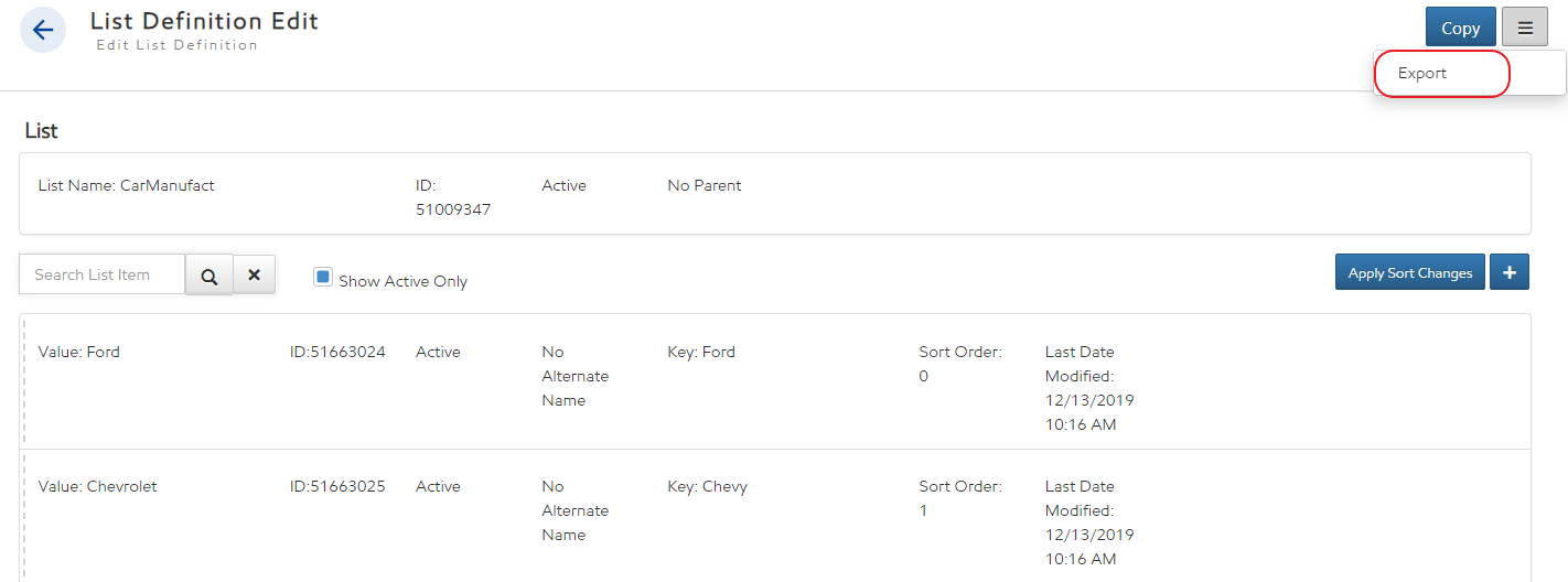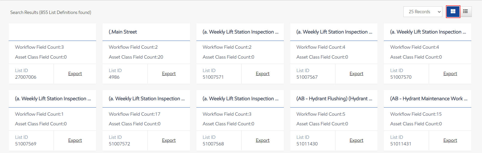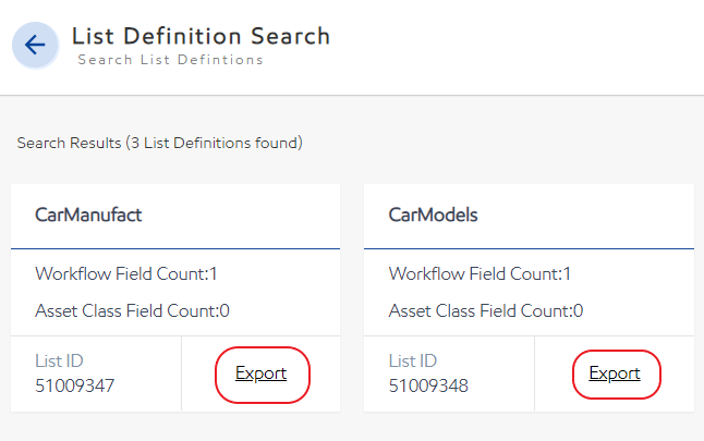 - From the List Definition page, select Export for the list to be exported (Export in card view, Excel icon in list view).