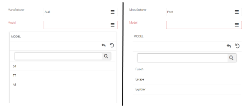 - When a value is selected in the parent field, the available options in the child list are filtered.
