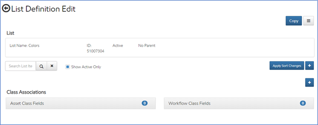 Class Associations are displayed at the bottom of the page. These lists identify all the Asset Class and Workflow fields that use this list. Once the list is created, it can be associated with asset classes and workflows by selecting this list when defining fields in an asset class or workflow.