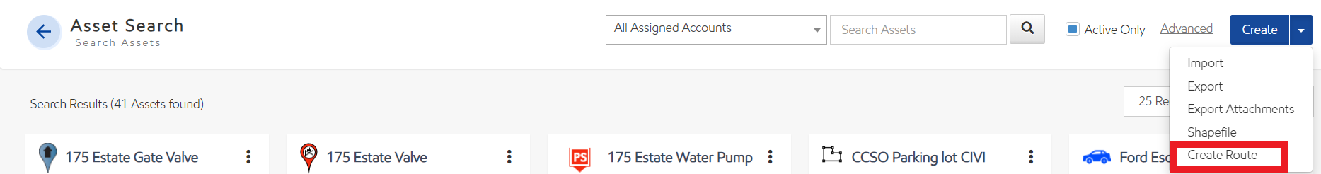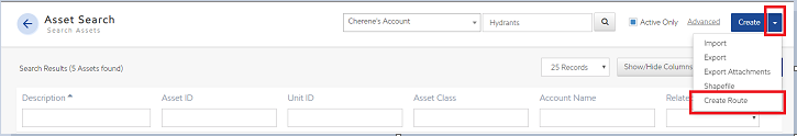 - From the Asset Search screen, filter the assets to be included in the route, select the dropdown next to the Create button and select Create Route
