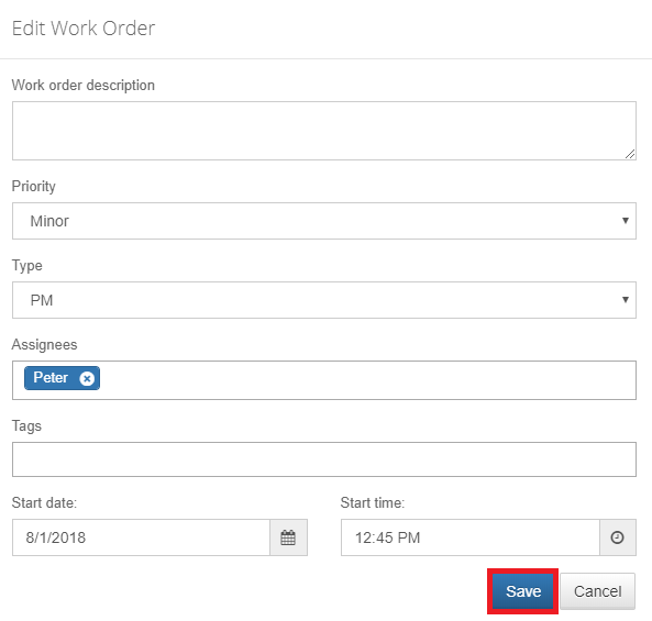 - Edit: Users can edit work orders by selecting the Edit Work Order button. This will allow the user to edit the Work Order's Description, Priority, Type, Assignees, Tags, and start date.