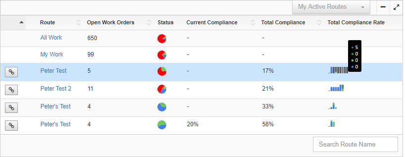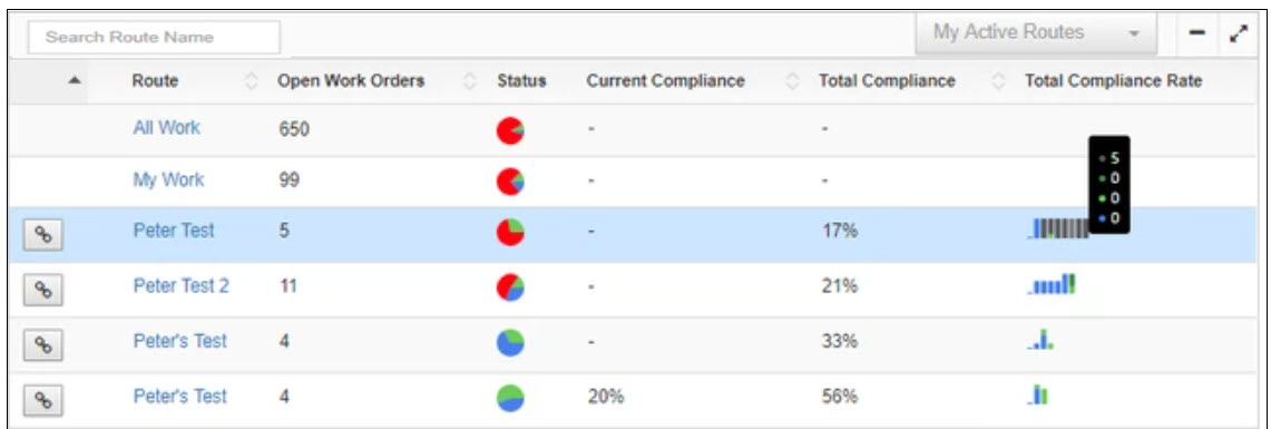 - Total Compliance Rate: displays a bar for each time a route is completed for a maximum of eight routes. The Graph will show a numerical value for each category when hovered over.