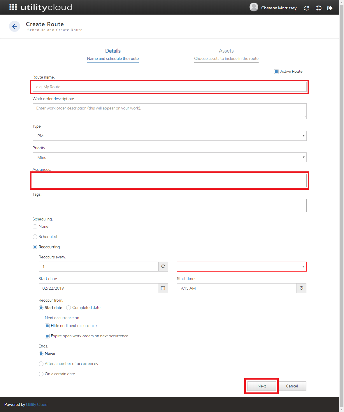 - Priority: Select a priority for the route. (Minor, Major, Critical, etc...) This priority is displayed on the work order.