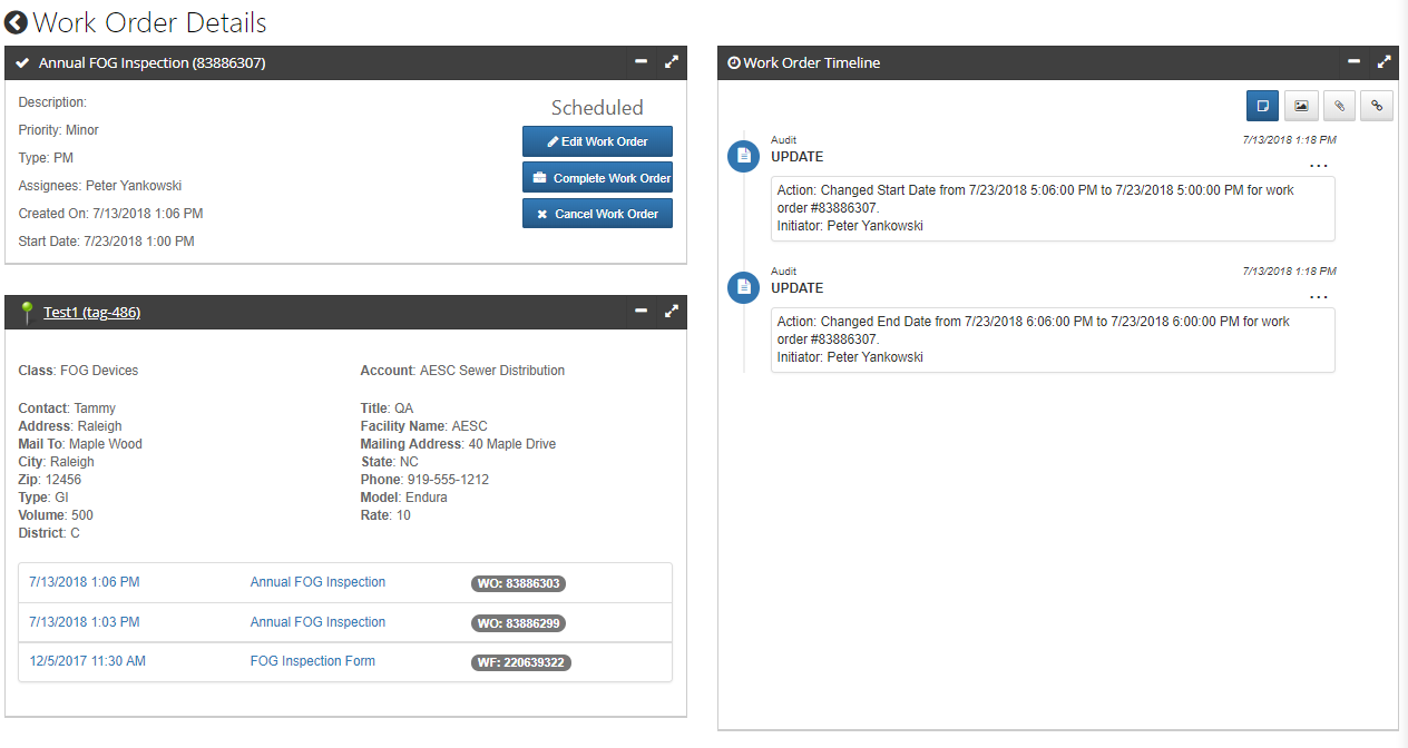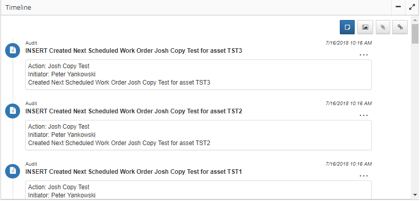 - Work Order Timeline: Users can view a timeline of changes made to a work order on the right side of the screen. Users can add notes and attachments to this area as well.