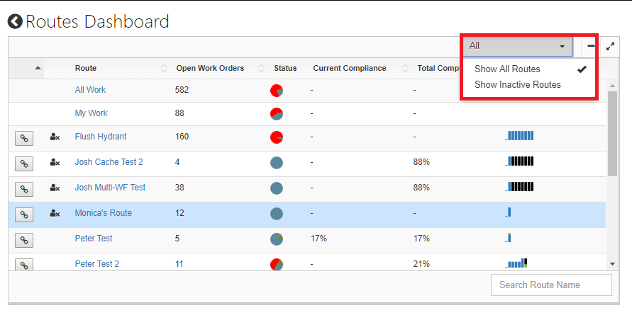 Users can view routes using the dropdown in the route display area. The user can choose to view all routes, inactive routes, or only their active routes. The user can search for a route by typing a keyword into the search bar in the lower right corner. This search will take into account the filters applied to the window. Selecting the link icon next to a Route's name will bring up its details.