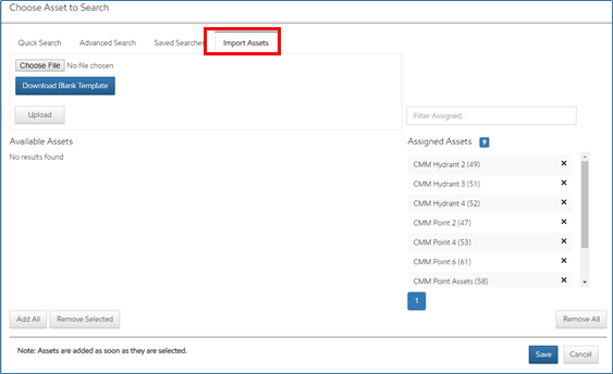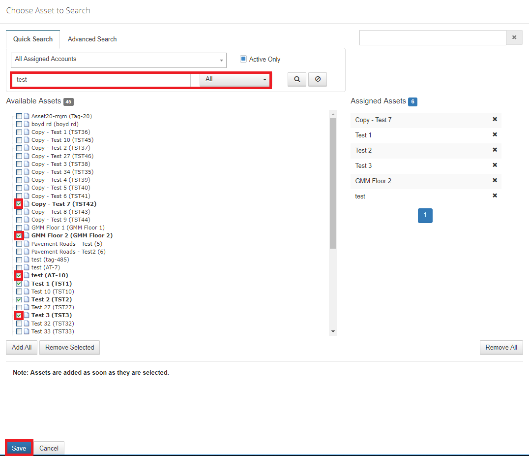 Assets can be searched using either a quick or advanced search. The Assets selector will allow the user to select a parent, a parent, and children, one asset individually, etc. Users can ADD ALL or Remove Selected or simply remove one asset from the list on the left. When assets are added they will appear in the Assigned Assets column on the left. The search bar at the top of the assigned assets allows the user to ensure that particular assets are added.