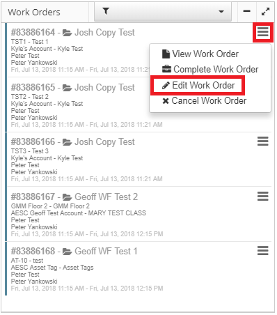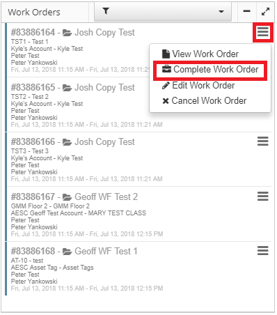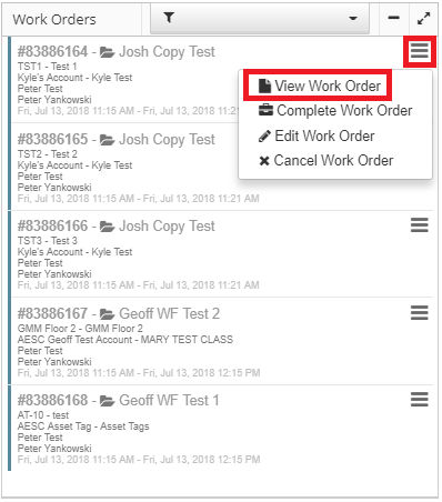- In the Work Orders section, select the Triple Bar of the desired asset.