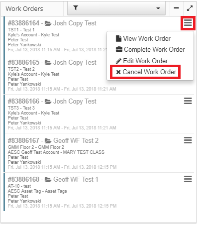 - Canceled: Displays all Work Orders with the "Canceled" status. Canceled Work Orders are displayed in grey and have their names crossed out.