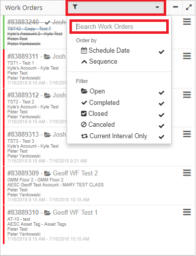 - Expired: Displays Work Orders that were not completed or canceled in the interval set and will have an X next to the name