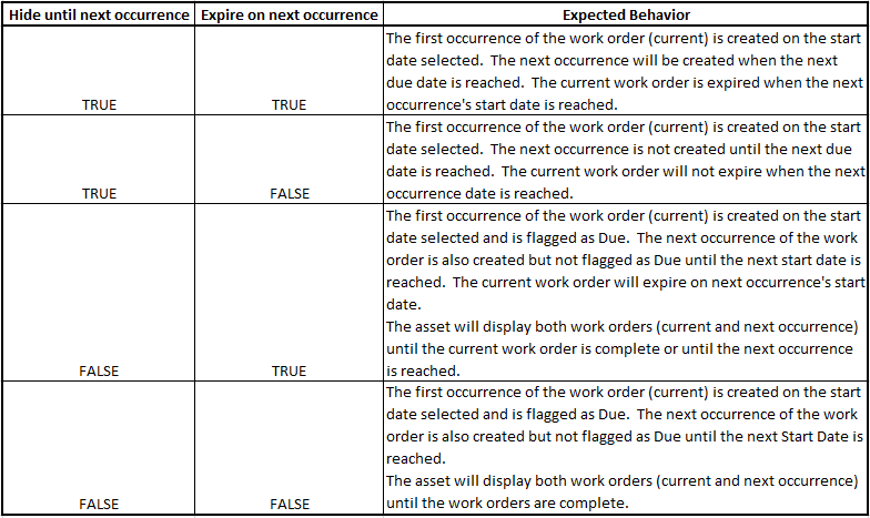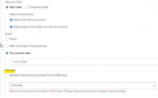 - Expire open work orders on the next occurrence cannot be selected when scheduling a start date before the current date.