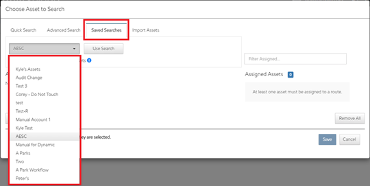- Select the Saved Search then select Use Search. All assets returned by that Saved Search will be included in the Route.
