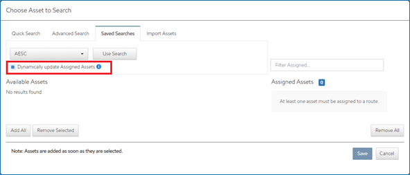 When creating a Route from a Saved Search, once the search is selected select Dynamically update Assigned Assets, then select Use Search.