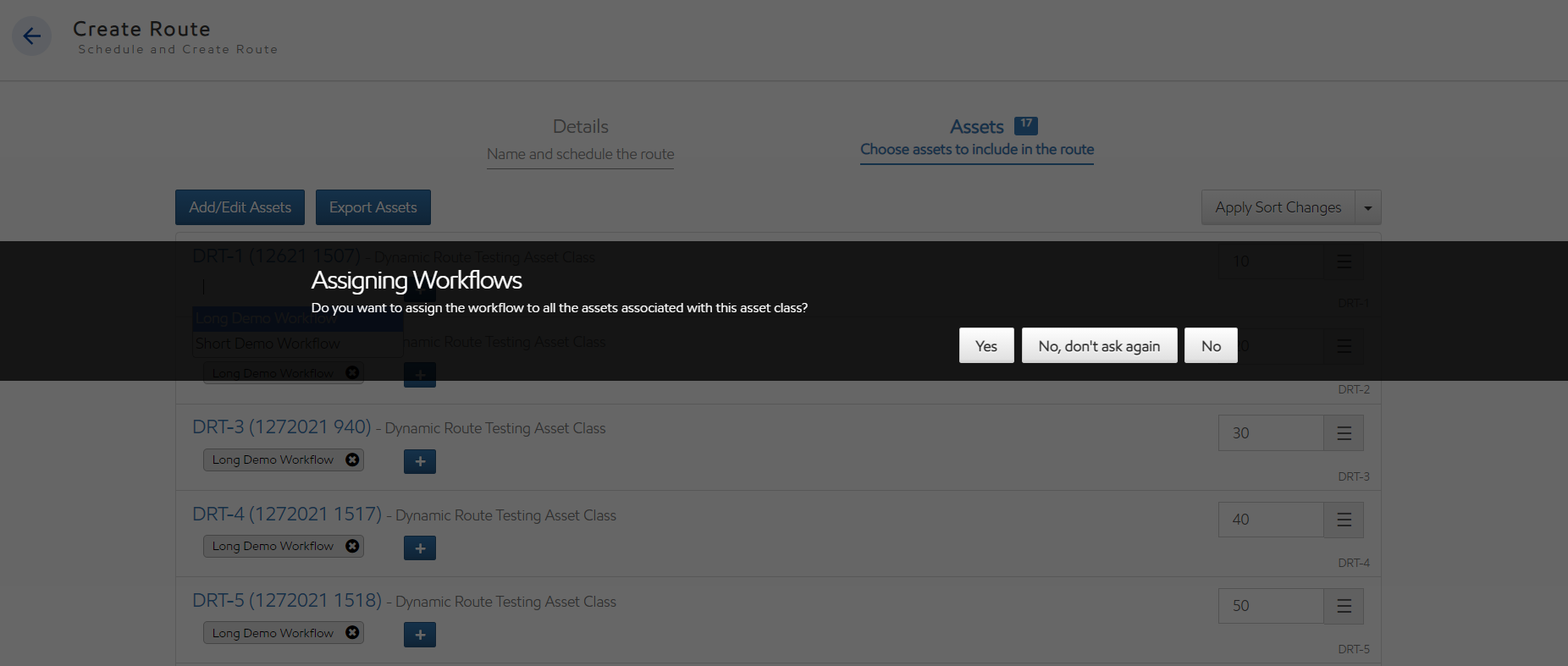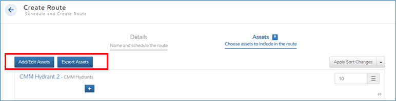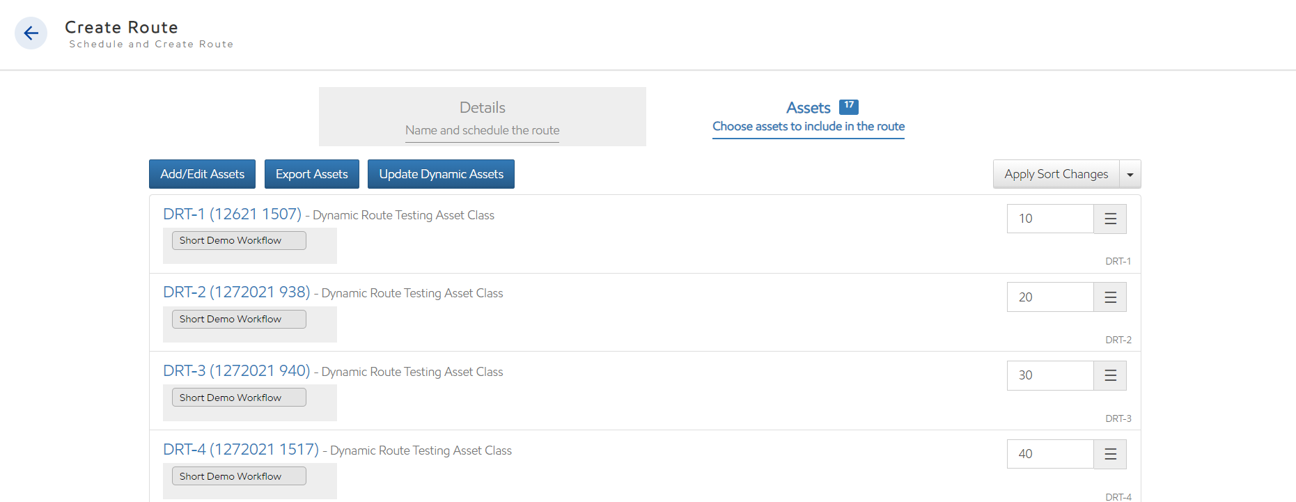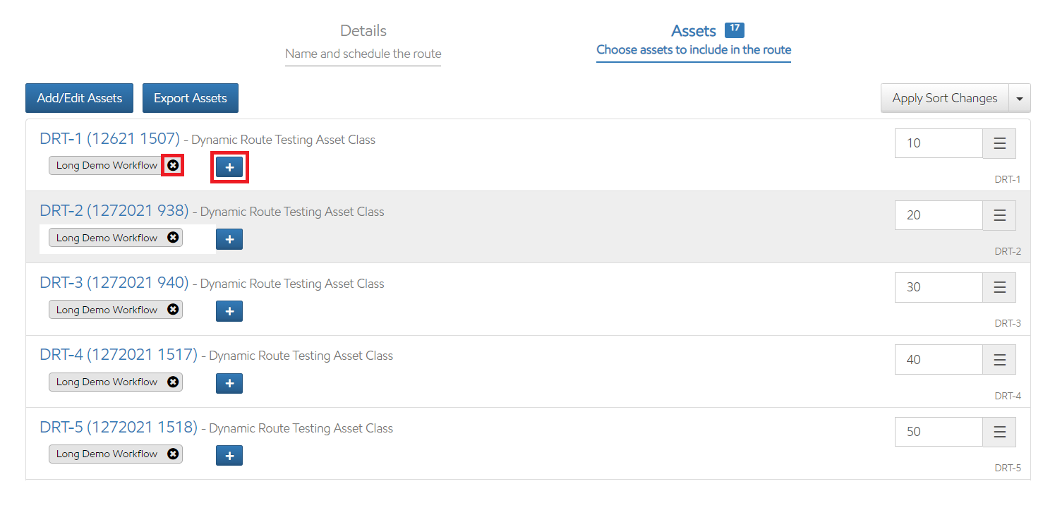 Assets/Workflows can be sorted by dragging and dropping them into the correct sequence or adjusting the number found on the right side of the asset. This sequence is adjusted when the Apply Sort Changes button is selected. The sort order is used to determine the sequence of work orders when they are sorted by "Sequence" on the Routes Dashboard.