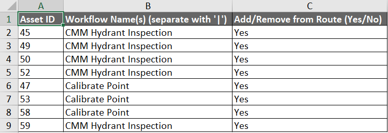 A Microsoft Excel Sheet is downloaded. Users can add assets to the route along with the workflow assigned, edit the assigned workflows, or remove assets already in the route in bulk:
