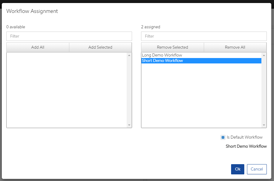 Assets are assigned the default workflow on the asset class, or the first workflow assigned to that asset class if there is no default. A new workflow can be assigned or the existing workflow removed by selecting the plus icon to add or the x on the workflow to remove: