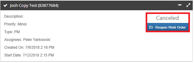 - Reopen Work Order: Users can reopen closed or canceled work orders by selecting the Reopen Work Order button.