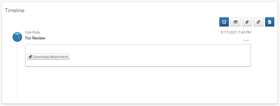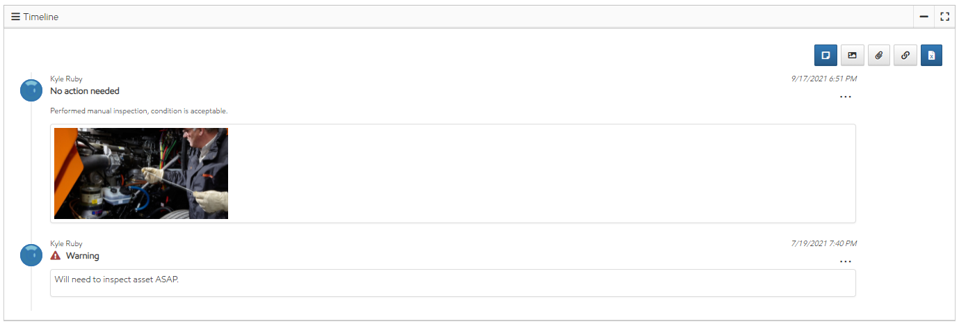 From here, you can add a note to your asset and view or reply to other user's notes. You can also view any timeline entry generated by an asset or workflow trigger.