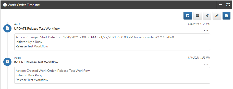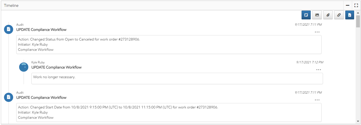 Like assets, every work order has a timeline to view and add comments on the Work Order Details page. Audits for creating and editing work orders, unlike most audits in Utility Cloud, will show in the work order timeline instead of the audit trail.