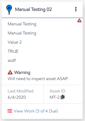 You can set any timeline entry as a warning so that it will show on the asset's card in the Asset Search's results:
