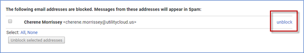Locate the blocked email address (postmaster.prod@utilitycloud.us) and click Unblock.