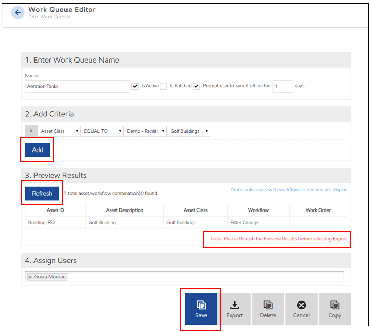- Add Criteria to the work queue. Criteria is based on the following asset attributes: Asset ID, Asset Description, Asset Class, Longitude, Latitude, Account, Attribute, Created on, Created by, Asset Indicator Text, Asset Type or Workflow.