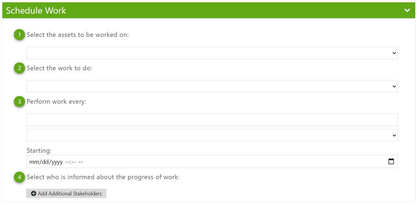 - Select the assets to be worked on: select one asset class for the work to be assigned to; all assets in this class will receive the same schedule for the work.